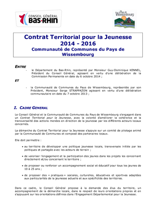 Le Département accompagne les communautés de communes par le biais de contrats territoriaux pour la jeunesse (CTJ). Le présent rapport soumet à votre approbation l'aide financière du Département à la communauté de communes du Pays de Wissembourg et à la communauté de communes du Pays d'Erstein. Il vous est également proposé de reconduire le cofinancement du poste d'animateur avec l'association Porte Ouverte.