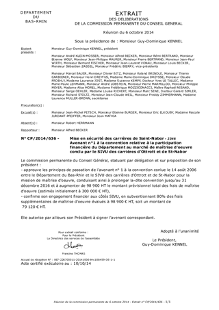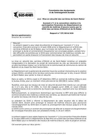 Le présent rapport a pour objet de présenter et d'approuver l'avenant n° 1 à la convention financière conclue le 14 août 2006 entre le Département et le SIVU des carrières d'Ottrott et de St-Nabor, pour la mission de maîtrise d'oeuvre, afin d'en prolonger la durée et corrolairement d'augmenter son enveloppe globale, compte-tenu des difficultés rencontrées par le SIVU pour commercialiser les matériaux extraits, qui permettent en partie d'assurer le financement des travaux de mise en sécurité.