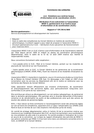 Dans le cadre des compétences du Conseil Général en matière de coordination gérontologique, le présent rapport a pour objet de proposer à l'association RESO 3 - structure gestionnaire d'un CLIC - l'attribution d'une subvention de fonctionnement pour l'exercice 2014.