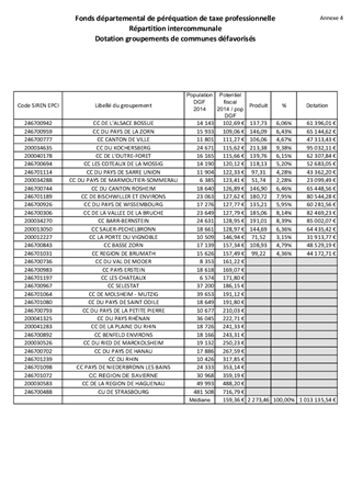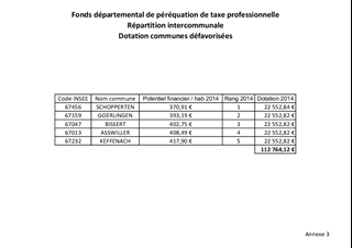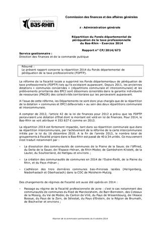 Répartition du Fonds départemental de péréquation de la taxe professionnelle du Bas-Rhin - Exercice 2014 Resumé Le présent rapport concerne la répartition 2014 du Fonds départemental de péréquation de la taxe professionnelle (FDPTP). Pièces jointes Délibération Rapport Annexe 1 Annexe 2 Annexe 3 Annexe 4 Assemblée : Commission Permanente Date : 06/10/2014 Rapporteur : Monsieur Bernard FISCHER Collectivité : Conseil départemental du Bas-Rhin Direction : Pôle ressources Service : Direction des finances et de la commande publique Domaine : Non renseigné Commission : M - Commission des finances et des affaires générales