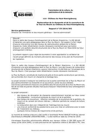 Dans le cadre des travaux d’aménagement de la Maison Alsacienne, il a été décidé d’implanter une salle pédagogique dans la Tour du Moulin. Cet espace n'a fait l'objet d'aucune intervention lors des travaux de restructuration globale de la Maison Alsacienne. Cette réhabilitation s’avère nécessaire maintenant pour permettre d’assurer une parfaite sécurité structurelle de la Tour du Moulin et l’étanchéité du futur aménagement intérieur. Le présent rapport a pour objet de soumettre à votre approbation la validation de l’avant-projet définitif, du montant prévisionnel des travaux et du plan de financement de l'opération.