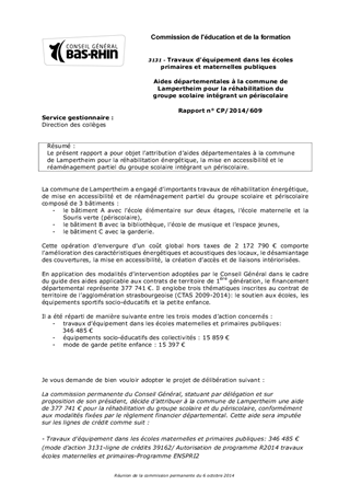 Le présent rapport a pour objet l’attribution d’aides départementales à la commune de Lampertheim pour la réhabilitation énergétique, la mise en accessibilité et le réaménagement partiel du groupe scolaire intégrant un périscolaire.
