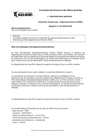 Le présent rapport concerne une demande de garantie présentée par le Pôle d’Archéologie Interdépartemental Rhénan (PAIR)