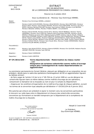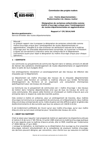 Le présent rapport vise à proposer la désignation de certaines collectivités comme maître d’ouvrage unique pour l’aménagement de routes départementales en agglomération, chargées à ce titre d’exercer les attributions relevant de la maîtrise d’ouvrage pour les chaussées départementales concernées, et à autoriser le Président à signer les conventions à intervenir entre ces collectivités et le Département (conventions ayant pour objet la désignation du maître d’ouvrage unique pour chaque opération).