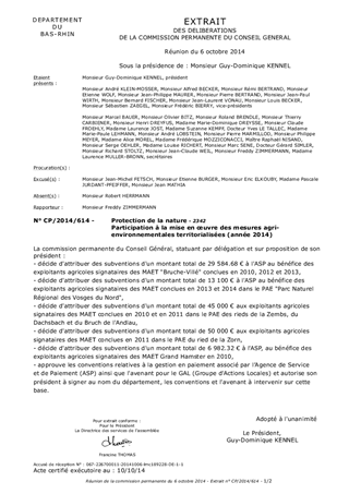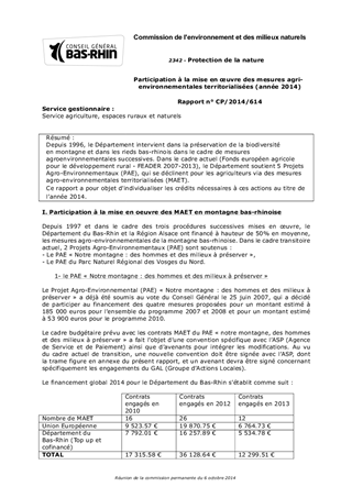 Depuis 1996, le Département intervient dans la préservation de la biodiversité en montagne et dans les rieds bas-rhinois dans le cadre de mesures agroenvironnementales successives. Dans le cadre actuel (Fonds européen agricole pour le développement rural - FEADER 2007-2013), le Département soutient 5 Projets Agro-Environnementaux (PAE), qui se déclinent pour les agriculteurs via des mesures agro-environnementales territorialisées (MAET). Ce rapport a pour objet d'individualiser les crédits nécessaires à ces actions au titre de l’année 2014.