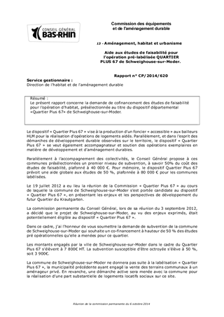 Le présent rapport concerne la demande de cofinancement des études de faisabilité pour l’opération d'habitat, présélectionnée au titre du dispositif départemental «Quartier Plus 67» de Schweighouse-sur-Moder.