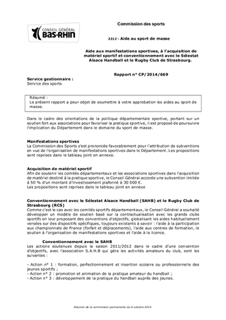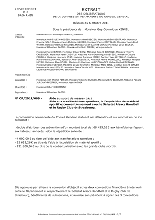 Aide aux manifestations sportives, à l’acquisition de matériel sportif et conventionnement avec le Sélestat Alsace Handball et le Rugby Club de Strasbourg.