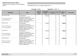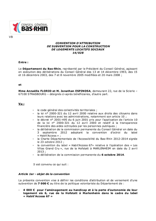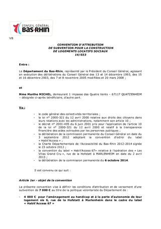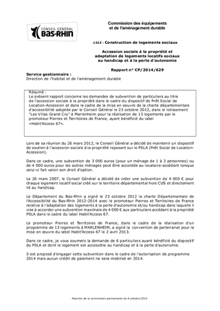 Le présent rapport concerne les demandes de subvention de particuliers au titre de l’accession sociale à la propriété dans le cadre du dispositif de Prêt Social de Location-Accession et dans le cadre de la mise en oeuvre de la charte départementale d’accessibilité adoptée par le Conseil Général le 23 octobre 2012, dans le lotissement "Les Villas Grand Cru" à Marlenheim pour la réalisation de 13 logements par le promoteur Pierres et Territoires de France, ayant bénéficié du label «Habit’Access 67».