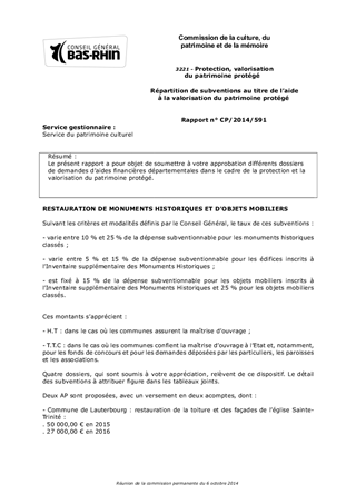 Le présent rapport a pour objet de soumettre à votre approbation différents dossiers de demandes d’aides financières départementales dans le cadre de la protection et la valorisation du patrimoine protégé.