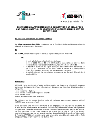 Lors de sa réunion du 5 novembre 2012, la commission permanente du Conseil Général avait retenu le principe d'expérimenter avec la SIBAR un dispositif de mise à l'abri et d'hébergement de ménages avec enfants, accompagnés par les services sociaux du Département. Mis en oeuvre effectivement depuis mai 2014, le dispositif a montré son intérêt tant pour les ménages concernés, que le Département ou encore le bailleur. Après cette expérimentation de 6 mois, le présent rapport vise à reconduire cette action sur une année entière, jusqu'en septembre 2015.