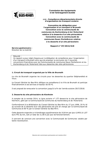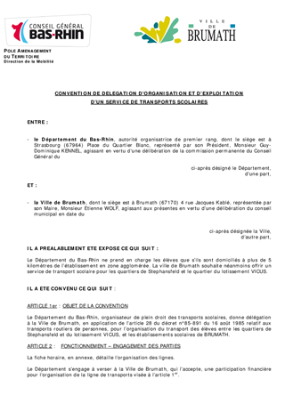 Ce rapport a pour objet d'approuver la délégation de compétence pour l'organisation d'un transport à Brumath ainsi que de proposer la conclusion de 2 nouvelles conventions financières avec les Communautés de communes Sauer Pechelbronn et du Kochersberg et de l'Ackerland liées aux dessertes des sites périscolaires.
