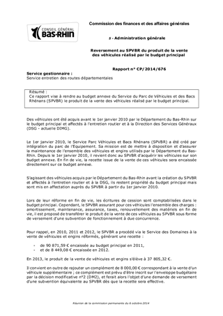 Ce rapport vise à rendre au budget annexe du Service du Parc de Véhicules et des Bacs Rhénans (SPVBR) le produit de la vente des véhicules réalisé par le budget principal.