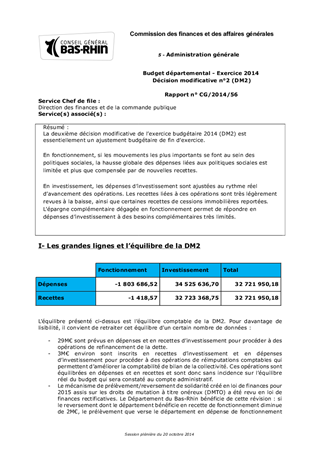 La deuxième décision modificative de l’exercice budgétaire 2014 (DM2) est essentiellement un ajustement budgétaire de fin d’exercice. En fonctionnement, si les mouvements les plus importants se font au sein des politiques sociales, la hausse globale des dépenses liées aux politiques sociales est limitée et plus que compensée par de nouvelles recettes. En investissement, les dépenses d’investissement sont ajustées au rythme réel d’avancement des opérations. Les recettes liées à ces opérations sont très légèrement revues à la baisse, ainsi que certaines recettes de cessions immobilières reportées. L’épargne complémentaire dégagée en fonctionnement permet de répondre en dépenses d’investissement à des besoins complémentaires très limités.