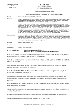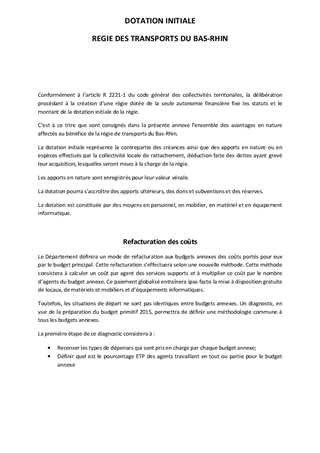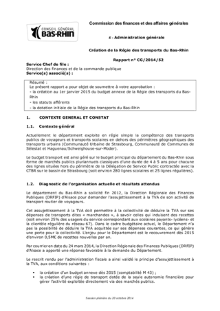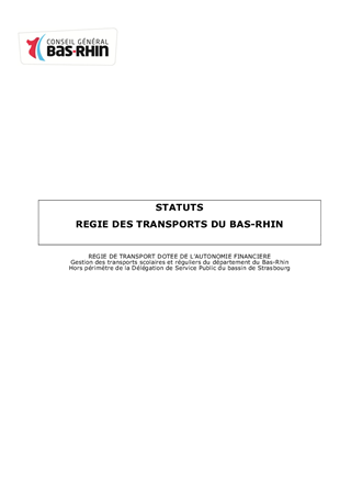 Le présent rapport a pour objet de soumettre à votre approbation : - la création au 1er janvier 2015 du budget annexe de la Régie des transports du Bas-Rhin - les statuts afférents - la dotation initiale de la Régie des transports du Bas-Rhin
