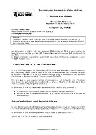Le présent rapport vise à proroger, pour une durée supplémentaire de trois ans, le dispositif actuel de la taxe d'aménagement adopté lors de la séance du Conseil Général du 24 octobre 2011.