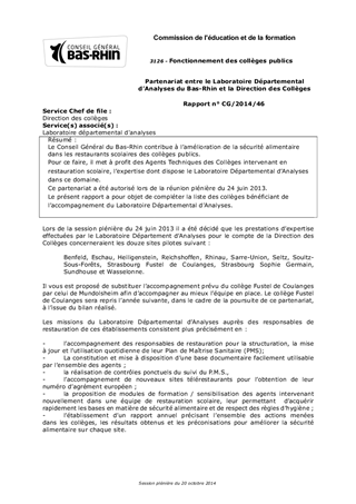 Le Conseil Général du Bas-Rhin contribue à l’amélioration de la sécurité alimentaire dans les restaurants scolaires des collèges publics. Pour ce faire, il met à profit des Agents Techniques des Collèges intervenant en restauration scolaire, l’expertise dont dispose le Laboratoire Départemental d’Analyses dans ce domaine. Ce partenariat a été autorisé lors de la réunion plénière du 24 juin 2013. Le présent rapport a pour objet de compléter la liste des collèges bénéficiant de l’accompagnement du Laboratoire Départemental d’Analyses.