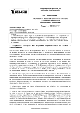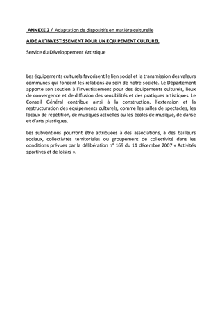 Le présent rapport a pour objet de soumettre à votre approbation une adaptation aux réalités nouvelles de deux dispositifs de soutien à l’investissement dans le domaine culturel, à savoir d'une part la lecture publique par une adaptation des prestations offertes aux bibliothèques du réseau départemental, et d'autre part l’aide aux écoles de musique.