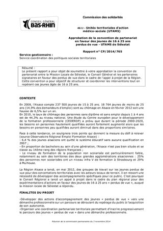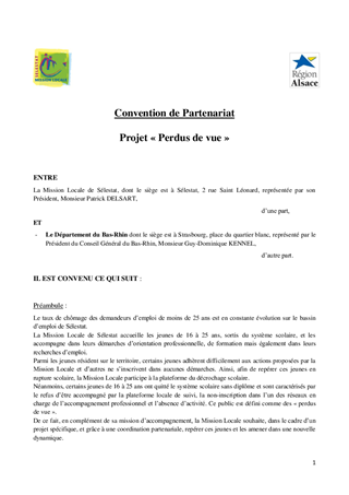 Le présent rapport a pour objet de soumettre à votre approbation la convention de partenariat entre la Mission Locale de Sélestat, le Conseil Général et les partenaires signataires en faveur des perdus de vue dans le cadre de l'appel à projet de la Région. Cette convention a pour objectif de structurer et coordonner les interventions tout en repérant ces jeunes âgés de 16 à 25 ans.