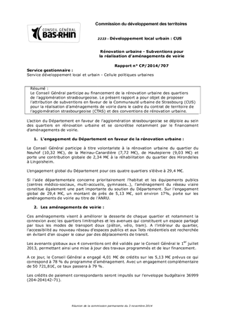 Le Conseil Général participe au financement de la rénovation urbaine des quartiers de l'agglomération strasbourgeoise. Le présent rapport a pour objet de proposer l'attribution de subventions en faveur de la Communauté urbaine de Strasbourg (CUS) pour la réalisation d'aménagements de voirie dans le cadre du contrat de territoire de l'agglomération strasbourgeoise (CTAS) et des conventions de rénovation urbaine.