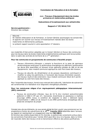 En matière d'éducation et de formation, le Conseil Général accompagne les collectivités et apporte son soutien aux travaux d'investissement réalisés dans les écoles maternelles et élémentaires publiques. Le présent rapport soumet à votre approbation 17 dossiers.