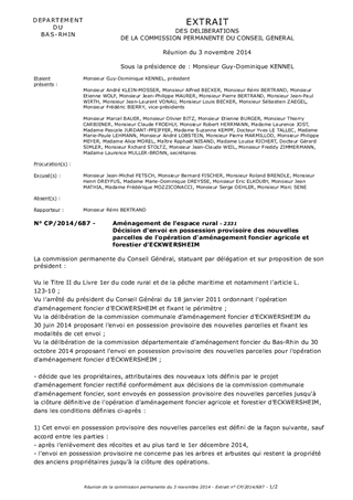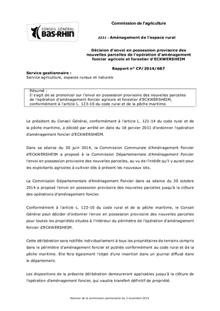 Il s'agit de se prononcer sur l'envoi en possession provisoire des nouvelles parcelles de l'opération d'aménagement foncier agricole et forestier d'ECKWERSHEIM, conformément à l'article L. 123-10 du code rural et de la pêche maritime.
