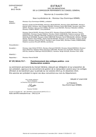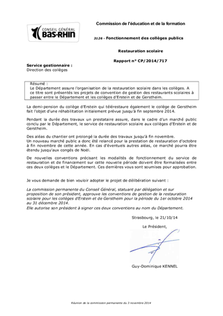 Le Département assure l'organisation de la restauration scolaire dans les collèges. A ce titre sont présentés les projets de convention de gestion des restaurants scolaires à passer entre le Département et les collèges d'Erstein et de Gerstheim.