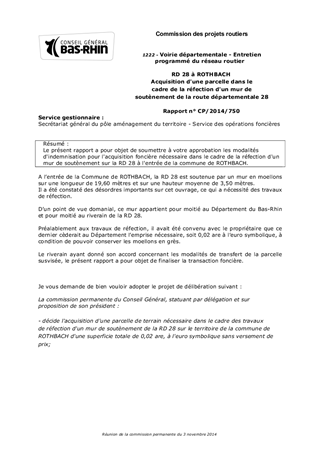 Le présent rapport a pour objet de soumettre à votre approbation les modalités d'indemnisation pour l'acquisition foncière nécessaire dans le cadre de la réfection d'un mur de soutènement sur la RD 28 à l'entrée de la commune de ROTHBACH.