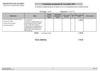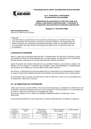 La préservation du patrimoine et les actions culturelles qui en découlent sont des axes importants de la politique menée par le Conseil Général. Les propositions du présent rapport qui concernent plus particulièrement l'aide aux sociétés d'histoire et la cotisation annuelle 2014 à la Fondation du Patrimoine, s'inscrivent dans ces orientations.
