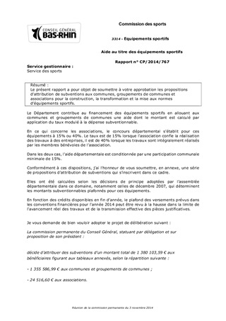 Le présent rapport a pour objet de soumettre à votre approbation les propositions d’attribution de subventions aux communes, groupements de communes et associations pour la construction, la transformation et la mise aux normes d’équipements sportifs.