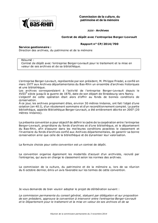 Contrat de dépôt avec l’entreprise Berger-Levrault pour le traitement et la mise en valeur de ses archives et de sa bibliothèque.