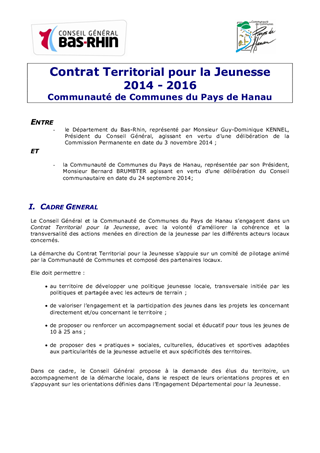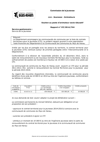 Le Département accompagne les communautés de communes par le biais de contrats territoriaux pour la jeunesse (CTJ). Le présent rapport soumet à votre approbation l'aide financière du Département à la Communauté de Communes du Pays de Hanau.