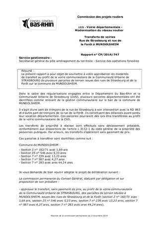 Le présent rapport a pour objet de soumettre à votre approbation les modalités de transfert au profit de la voirie communautaire de la Communauté Urbaine de STRASBOURG de plusieurs parcelles de terrain issues des rues de Strasbourg et de la Forêt sur la commune de MUNDOLSHEIM.