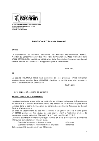 Le Conseil Général du Bas-Rhin a procédé à la construction du centre technique du Conseil Général de Wissembourg, mis en service en mai 2014. Le présent rapport vise à conclure un protocole transactionnel avec la société HEMMERLE RENE SAS en charge des travaux de gros œuvre. La société HEMMERLE RENE SAS a mis en place une quantité supérieure d’armature à celle prévue à son marché. Les prestations n’ont pas fait l’objet d’un avenant. Selon les prix du marché, la rémunération de ces prestatations supplémentaires aurait représenté une dépense de 23 430,10 € HT soit 28 116,12 € TTC. Afin d'éviter un contentieux, une négociation a été entreprise avec la société pour que le coût de la dépense soit réparti entre le Département, le bureau d'études et la société, soit une charge pour le Département établie à la somme forfaitaire de 13 000 €.