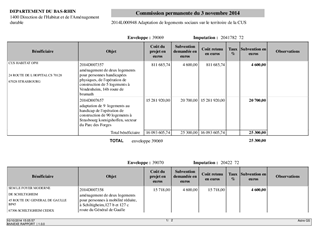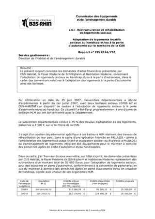 Le présent rapport concerne les demandes d'aides financières présentées par CUS Habitat, le Foyer Moderne de Schiltigheim et Habitation Moderne, concernant l'adaptation de logements sociaux au handicap et/ou à la perte d'autonomie, dans le cadre des conventions relatives à l'adaptation des logements à la perte d'autonomie avec ces bailleurs.