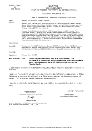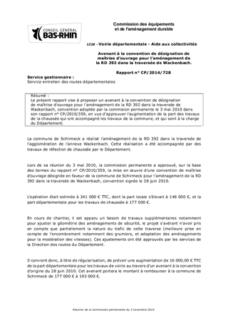 Le présent rapport vise à proposer un avenant à la convention de désignation de maîtrise d'ouvrage pour l'aménagement de la RD 392 dans la traversée de Wackenbach, convention adoptée par la commision permanente le 3 mai 2010 dans son rapport n° CP/2010/359, en vue d'approuver l'augmentation de la part des travaux de la chaussée qui ont accompagné les travaux de la commune, et qui sont à la charge du Département.