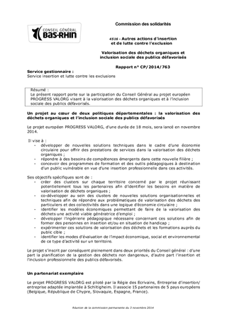 Le présent rapport porte sur la participation du Conseil Général au projet européen PROGRESS VALORG visant à la valorisation des déchets organiques et à l’inclusion sociale des publics défavorisés.