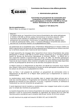 Ce rapport porte sur l’acquisition d’une licence d’exploitation des cartes géologiques à l’échelle 1/50 000 au format vecteur harmonisé sur le territoire alsacien. Cette acquisition serait réalisée en collaboration avec la Région Alsace, à travers un groupement de commandes. Comme pour la majorité des données acquises dans le cadre du partenariat CIGAL, celles –ci seraient diffusées à l’ensemble des acteurs œuvrant sur le territoire alsacien via la géoplateforme CIGAL.