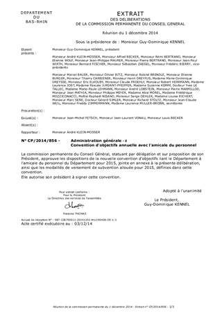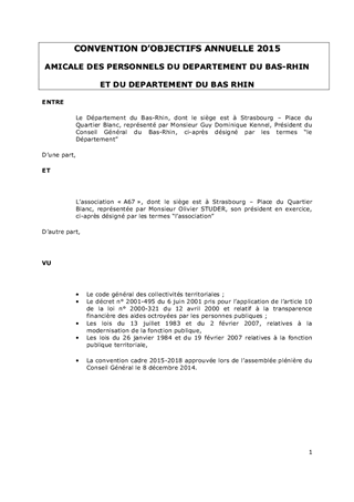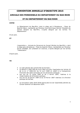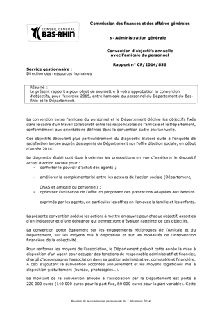Le présent rapport a pour objet de soumettre à votre approbation la convention d’objectifs, pour l’exercice 2015, entre l’amicale du personnel du Département du Bas-Rhin et le Département.