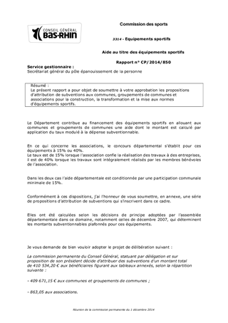 Le présent rapport a pour objet de soumettre à votre approbation les propositions d’attribution de subventions aux communes, groupements de communes et associations pour la construction, la transformation et la mise aux normes d’équipements sportifs.