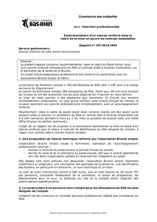 Le présent rapport concerne l’expérimentation, dans le cadre du Pacte Social Local, d’un tutorat renforcé d’allocataires du RSA en contrats aidés à horaires modulables, sur le périmètre de la vallée de la Bruche. Ce projet d’accompagnement professionnel est construit en partenariat avec les associations Bruche emploi et Déclic.
