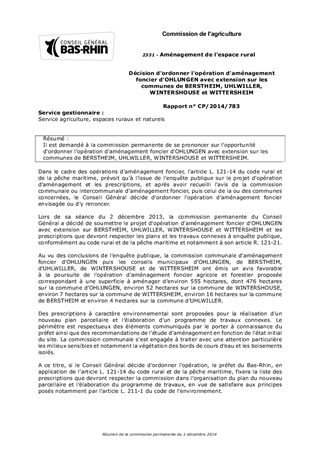 Il est demandé à la commission permanente de se prononcer sur l'opportunité d'ordonner l'opération d'aménagement foncier d'OHLUNGEN avec extension sur les communes de BERSTHEIM, UHLWILLER, WINTERSHOUSE et WITTERSHEIM.