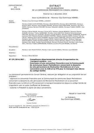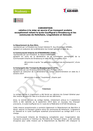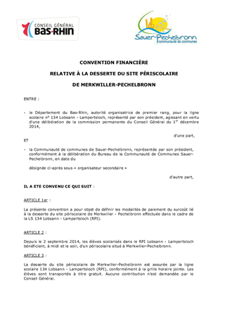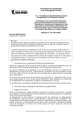 Ce rapport a pour objet de proposer la conclusion d'une convention financière avec la Communauté de communes Sauer-Pechelbronn dans le cadre de la desserte du site périscolaire de Merkwiller-Pechelbronn (LS 134). Il présente également les modalités de mise en œuvre du transport scolaire entre le lycée Couffignal de Strasbourg et les communes de Lingolsheim, Holtzheim et Ostwald suite à la fermeture provisoire du collège Galilée de Lingolsheim. Le transport scolaire est assuré par la CTS, concessionnaire du réseau de transport urbain de la CUS, depuis le 8 septembre 2014. Le coût du service est estimé à 518 164 € HT par an (avec possibilité de résiliation anticipée).