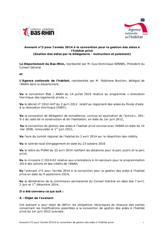 Le présent rapport concerne la validation de l'avenant n°3 pour l’année 2014 à la convention pour la gestion des aides à l’habitat privé, suite à des enveloppes complémentaires des crédits de l’ANAH (agence nationale de l'habitat) redéployées lors du Conseil d'Administration de l'ANAH du 7 octobre 2014.
