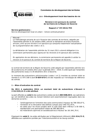 La méthodologie actuelle de suivi financier des contrats de territoire, adoptée par l'assemblée plénière le 26 octobre 2009, prévoit la réalisation de bilans financiers annuels, ainsi qu'une révision à mi-parcours qui comporte notamment l'actualisation de la programmation des volets 1 et 2. La délibération de l'assemblée plénière du 31 mars 2011 a donné délégation à la commission permanente pour approuver les révisions à mi-parcours des contrats. En application de ces décisions, la commission permanente est appelée à valider la révision à mi-parcours du contrat de territoire de la Région de Saverne.