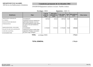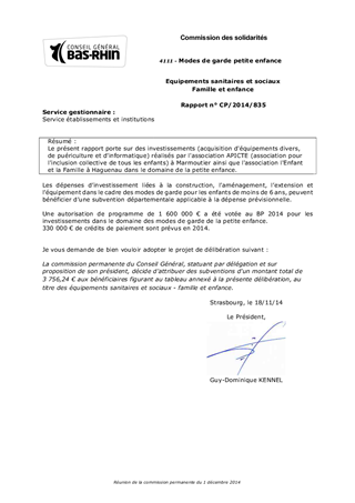 Le présent rapport porte sur des investissements (acquisition d'équipements divers, de puériculture et d'informatique) réalisés par l'association APICTE (association pour l'inclusion collective de tous les enfants) à Marmoutier ainsi que l'association l'Enfant et la Famille à Haguenau dans le domaine de la petite enfance.