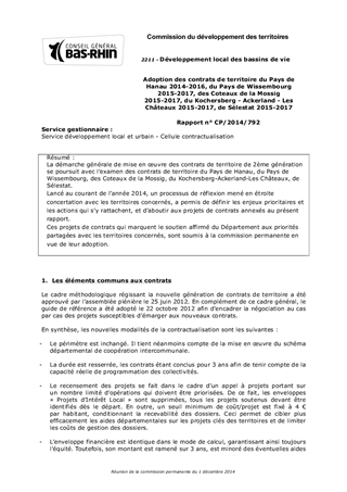 La démarche générale de mise en œuvre des contrats de territoire de 2ème génération se poursuit avec l’examen des contrats de territoire du Pays de Hanau, du Pays de Wissembourg, des Coteaux de la Mossig, du Kochersberg-Ackerland-Les Châteaux, de Sélestat. Lancé au courant de l’année 2014, un processus de réflexion mené en étroite concertation avec les territoires concernés, a permis de définir les enjeux prioritaires et les actions qui s’y rattachent, et d’aboutir aux projets de contrats annexés au présent rapport. Ces projets de contrats qui marquent le soutien affirmé du Département aux priorités partagées avec les territoires concernés, sont soumis à la commission permanente en vue de leur adoption.