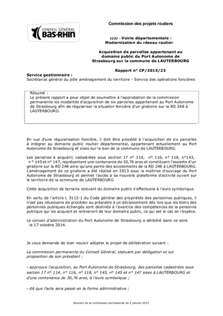 Le présent rapport a pour objet de soumettre à l'approbation de la commission permanente les modalités d’acquisition de six parcelles appartenant au Port Autonome de Strasbourg afin de régulariser la situation foncière d’un giratoire sur la RD 248 à LAUTERBOURG.
