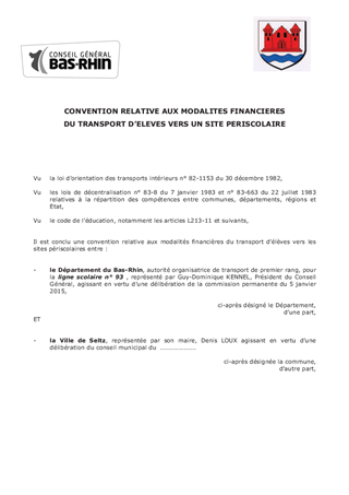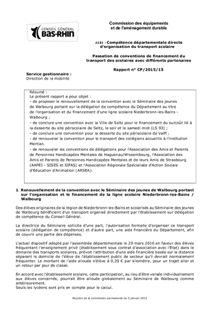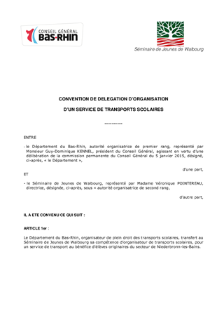 Le présent rapport a pour objet : - de proposer le renouvellement de la convention avec le Séminaire des jeunes de Walbourg portant sur la délégation de compétence du Département au titre de l'organisation et du financement d'une ligne scolaire Niederbronn-les-Bains - Walbourg ; - de conclure une convention avec la Ville de Seltz pour le financement du surcoût lié à la desserte du site périscolaire de Seltz, le soir et le samedi midi (LS 93) ; - de conclure une convention pour la desserte du site périscolaire de Valff ; - de renouveler la convention pour le transport des collégiens accueillis à l'institution Mertian. - de renouveler les conventions de délégations pour l'Association des Amis et Parents de Personnes Handicapées Mentales de Haguenau/Wissembourg, l'Association des Amis et Parents de Personnes Handicapées Mentales et de leurs Amis de Strasbourg (AAPEI - SISES et SIFAS) et l'Association Régionale Spécialisée d'Action Sociale d'Education d'Animation (ARSEA).