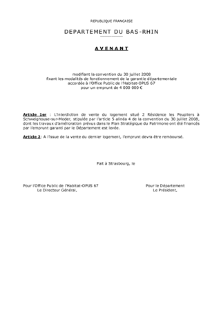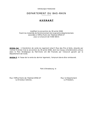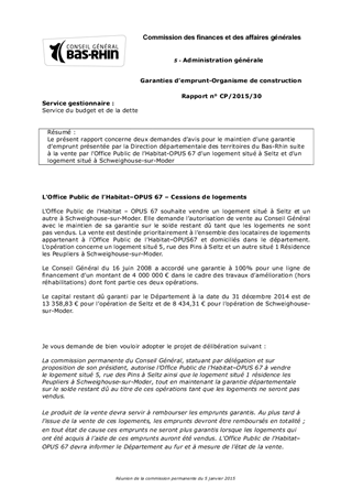 Le présent rapport concerne deux demandes d’avis pour le maintien d’une garantie d’emprunt présentée par la Direction départementale des territoires du Bas-Rhin suite à la vente par l’Office Public de l’Habitat-OPUS 67 d’un logement situé à Seltz et d’un logement situé à Schweighouse-sur-Moder