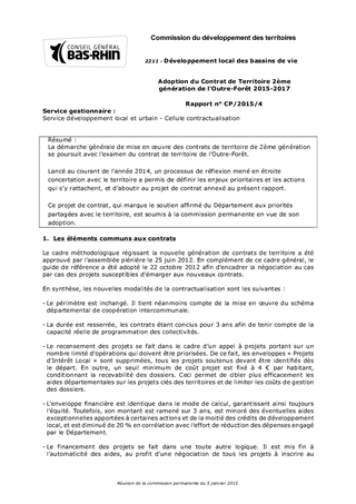 La démarche générale de mise en œuvre des contrats de territoire de 2ème génération se poursuit avec l’examen du contrat de territoire de l’Outre-Forêt. Lancé au courant de l’année 2014, un processus de réflexion mené en étroite concertation avec le territoire a permis de définir les enjeux prioritaires et les actions qui s’y rattachent, et d’aboutir au projet de contrat annexé au présent rapport. Ce projet de contrat, qui marque le soutien affirmé du Département aux priorités partagées avec le territoire, est soumis à la commission permanente en vue de son adoption.
